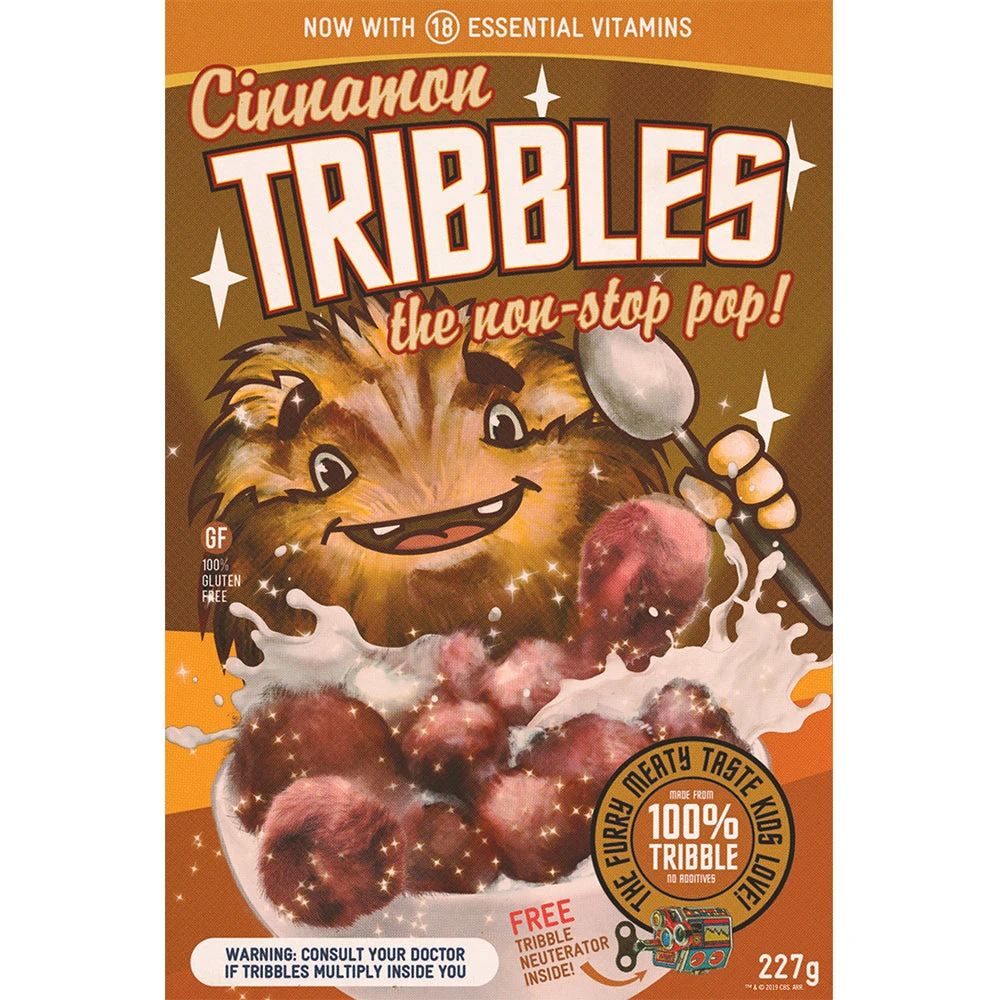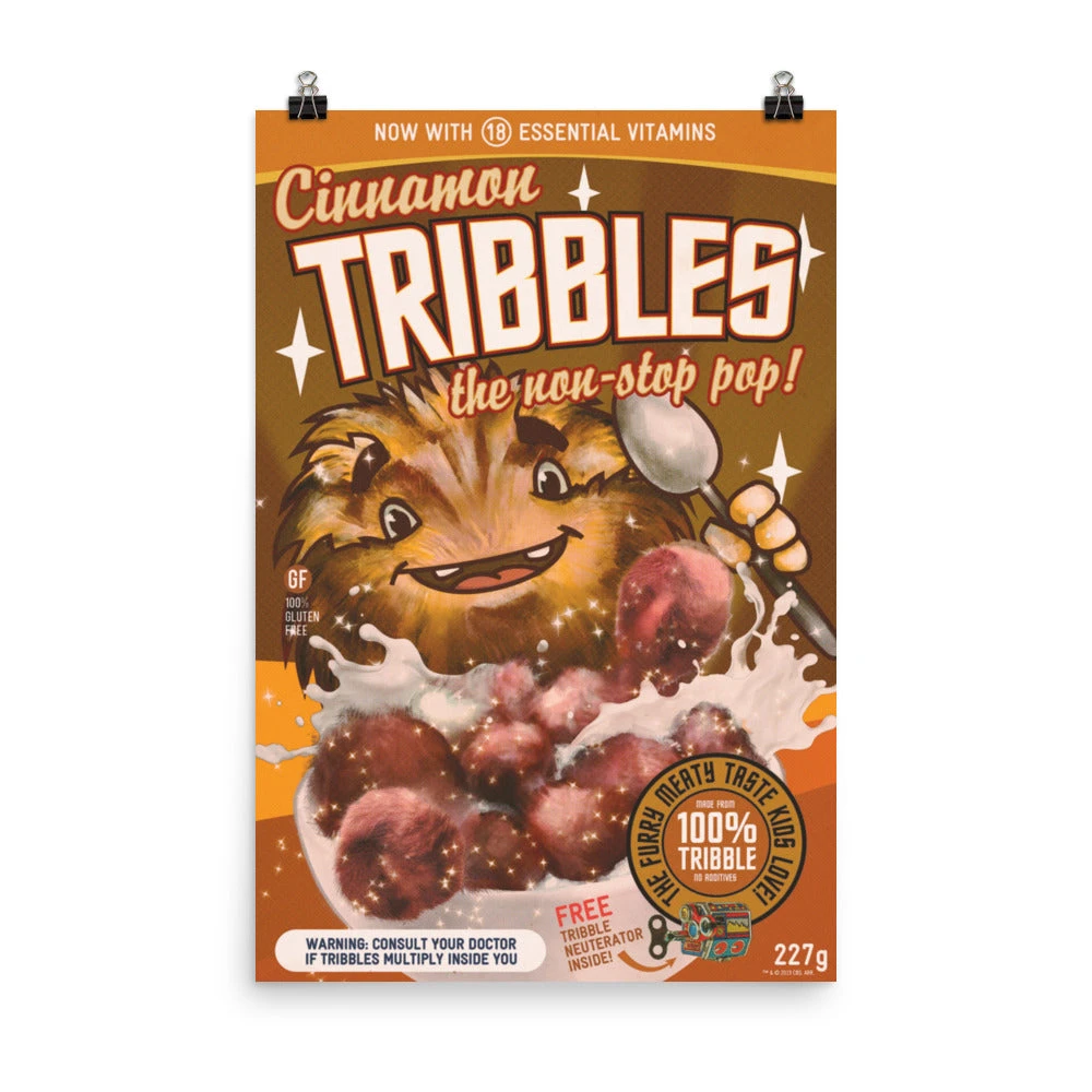 Put a pep in your step by enjoying the non-stop pop of Cinnamon Tribbles! Packed with 18 vitamins and the classic meaty flavor that kids love, Cinnamon Tribbles will quickly become a household breakfast staple. Featuring an adorable cinnamon tribble front and center, this hilarious Star Trek: Discovery Cinnamon Tribbles Poster is a must-have piece of decor for any fan.