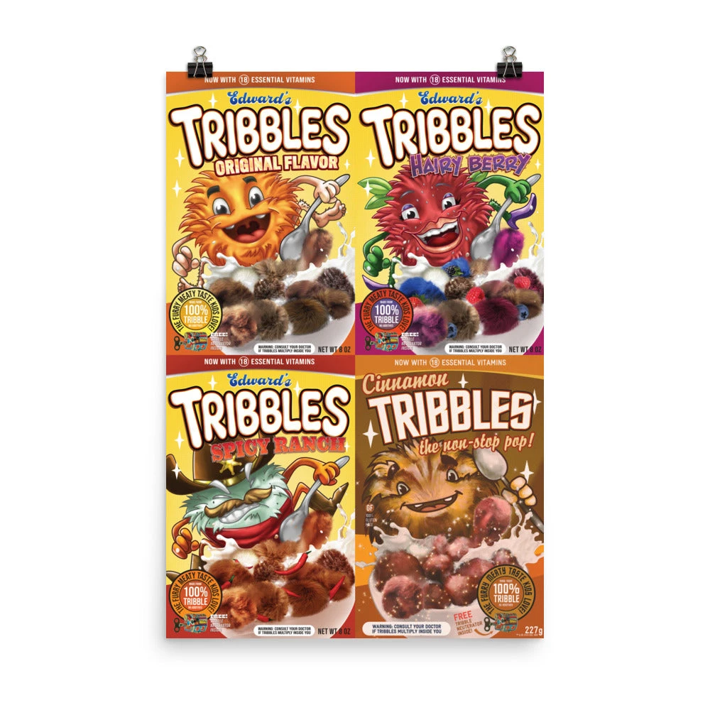 Are you in need of a nutritious nibble? Then fill your tummy with some delicious tribbles! Whether you love the Hairy Berry, Cinnamon, or Spicy Ranch flavor, this Star Trek: Discovery Tribbles Box Collage Poster represents the most delicious cereal brand in the galaxy. The best part? Tribbles multiply so quickly that you will never run out of your favorite breakfast again!