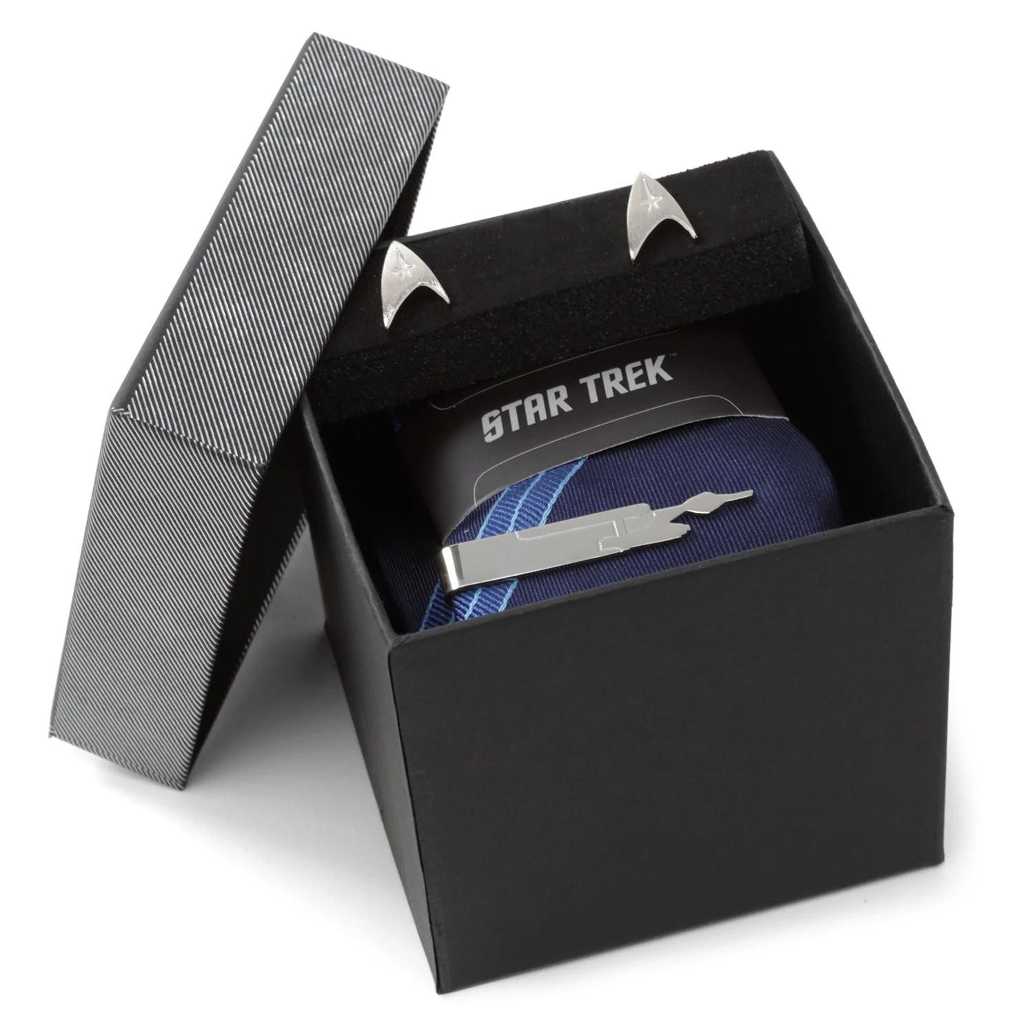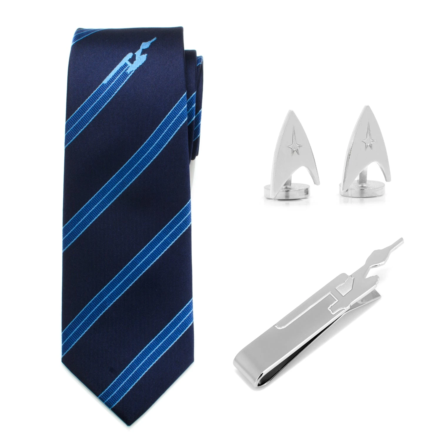The classic; the original. Fly high with this Star Trek gift pack, containing carefully-selected pieces designed to delight any Star Trek: The Original Series fans. Each set includes Starfleet emblem cufflinks, a U.S.S. Enterprise tie bar, and a 100% silk tie. Can be worn individually or as a set. Officially licensed by CBS Studios Inc.