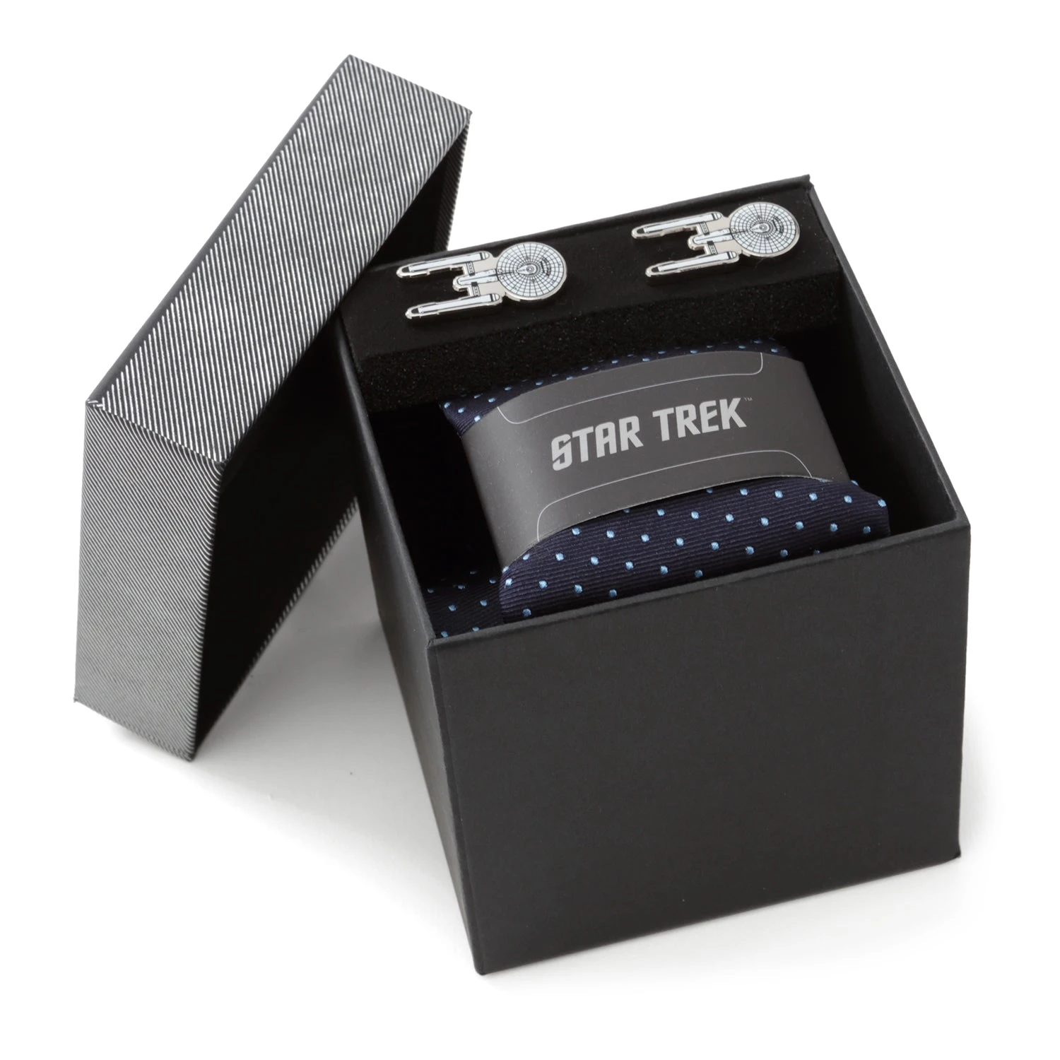 Fans of the U.S.S. Enterprise will love this gift set containing our Enterprise Dot Blue Men’s Tie and Enterprise Blue Print Cufflinks. Go boldly where no man has gone before, and look fantastic while you’re on the way. Officially licensed by CBS Studios Inc.