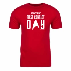 Perfect for your First Contact Day festivities, this comfortable Star Trek: First Contact Day White Logo Adult Short Sleeve T-Shirt lets you commemorate the first contact between humans and Vulcans with each wear. Available in multiple colors, this Star Trek t-shirt pairs well with any style.