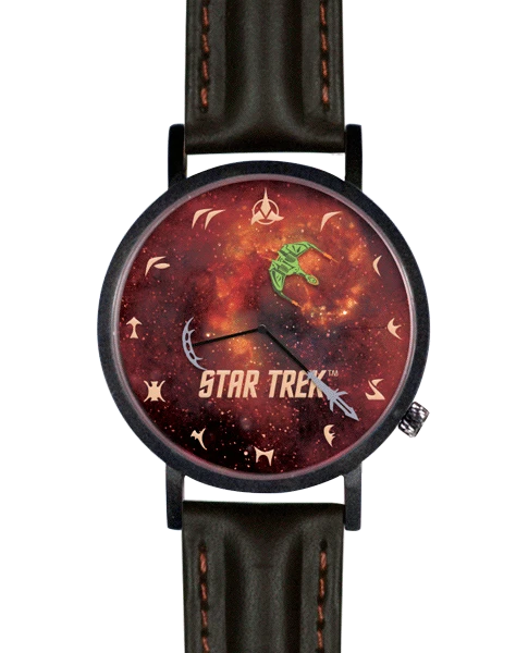 The official Star Trek Klingon Bird-of-Prey Watch features the Klingon ‘bat’leth’ on the hour hand, the Klingong ‘d’k tahg’ sword on the minute hand, and the symbol of the Klingon Empire in the 12 o’clock position. For fans of Kronos, Lieutenant Worf, or the Klingon Empire, this watch is the perfect collectible to channel their inner warrior spirit. This watch tells Earth time in Klingon numbers and the second hand is a menacing Bird-of-Prey cruising through space!
