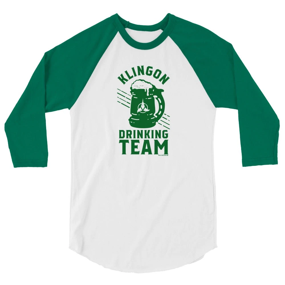 Every avid Star Trek fan is on the Klingon Drinking Team as they enjoy their favorite beverage! Represent your favorite series with the Star Trek Klingon Drinking Team 3/4 Sleeve Raglan Shirt!