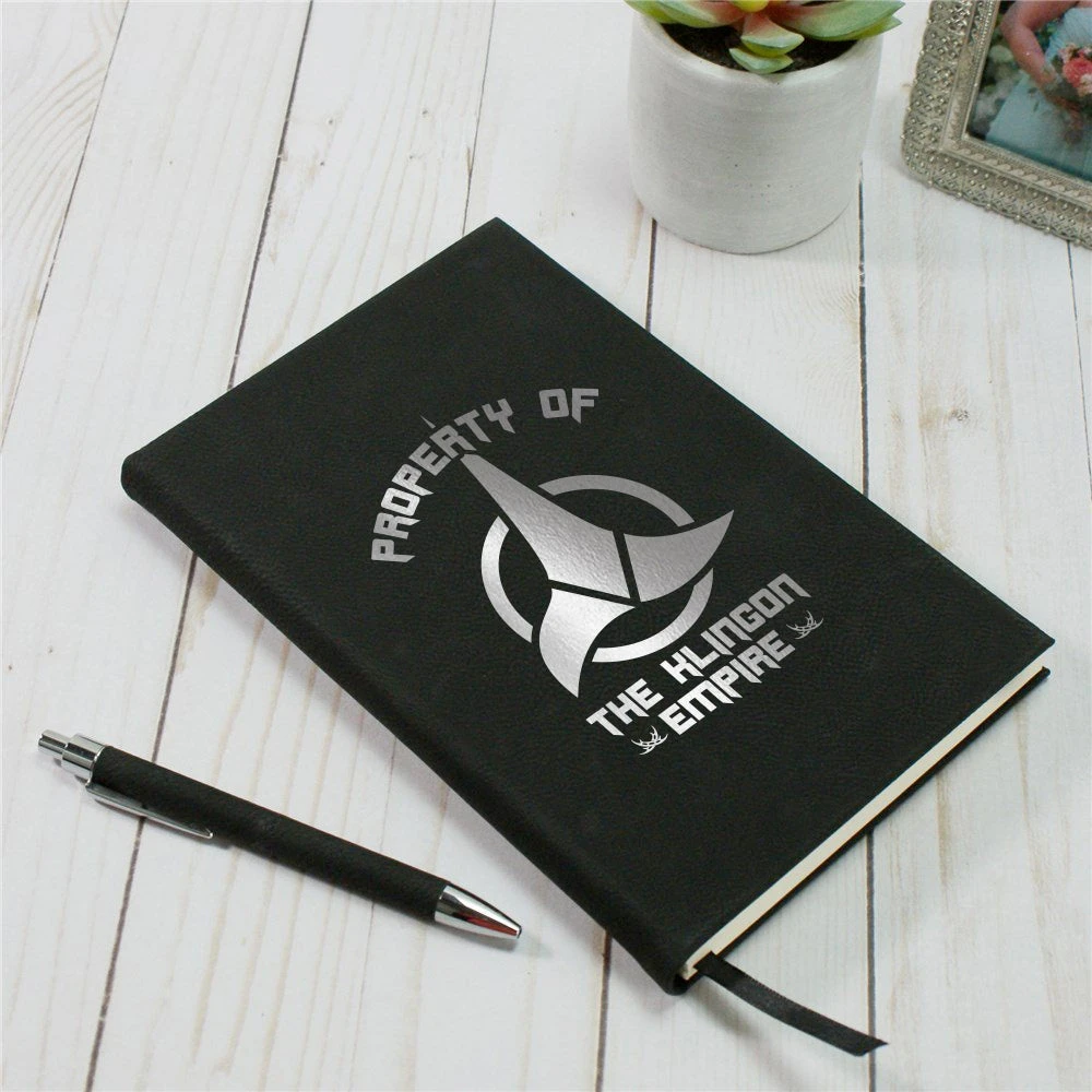 Keep all of your brilliant ideas in one place by adding this Star Trek Klingon Property Of Laser Engraved Notebook to your desk, backpack, or work bag. Featuring the Klingon logo and “Property of the Klingon Empire” laser engraved in red, this notebook makes a great gift for students and workers.