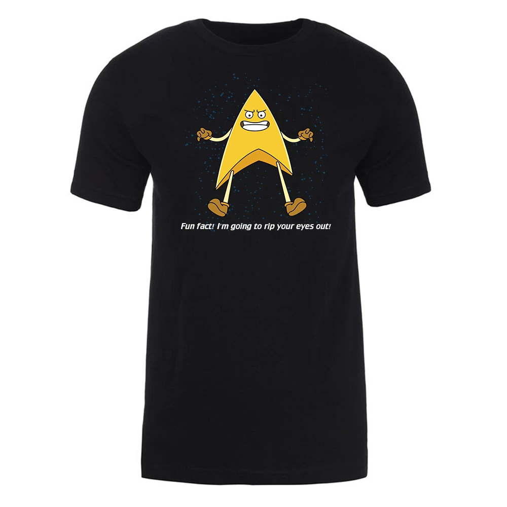 This Star Trek: Lower Decks Badgey Fun Fact Adult Short Sleeve T-Shirt lets you take your favorite (albeit a little aggressive) virtual assistant everywhere you go. Featuring Badgey threatening to rip your eyes out, this Star Trek: Lower Decks t-shirt is a hilarious addition to your style.