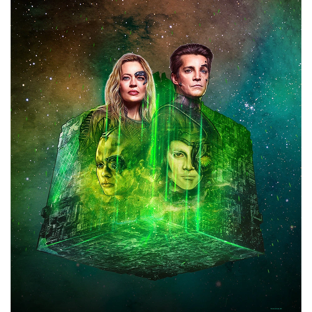 This Star Trek: Picard Borg Cube Portrait Sherpa Blanket is an eerily perfect addition to your home decor. Featuring Seven of Nine and Hugh within the green glow of the Borg Cube, this comfy sherpa was made for Star Trek marathons.