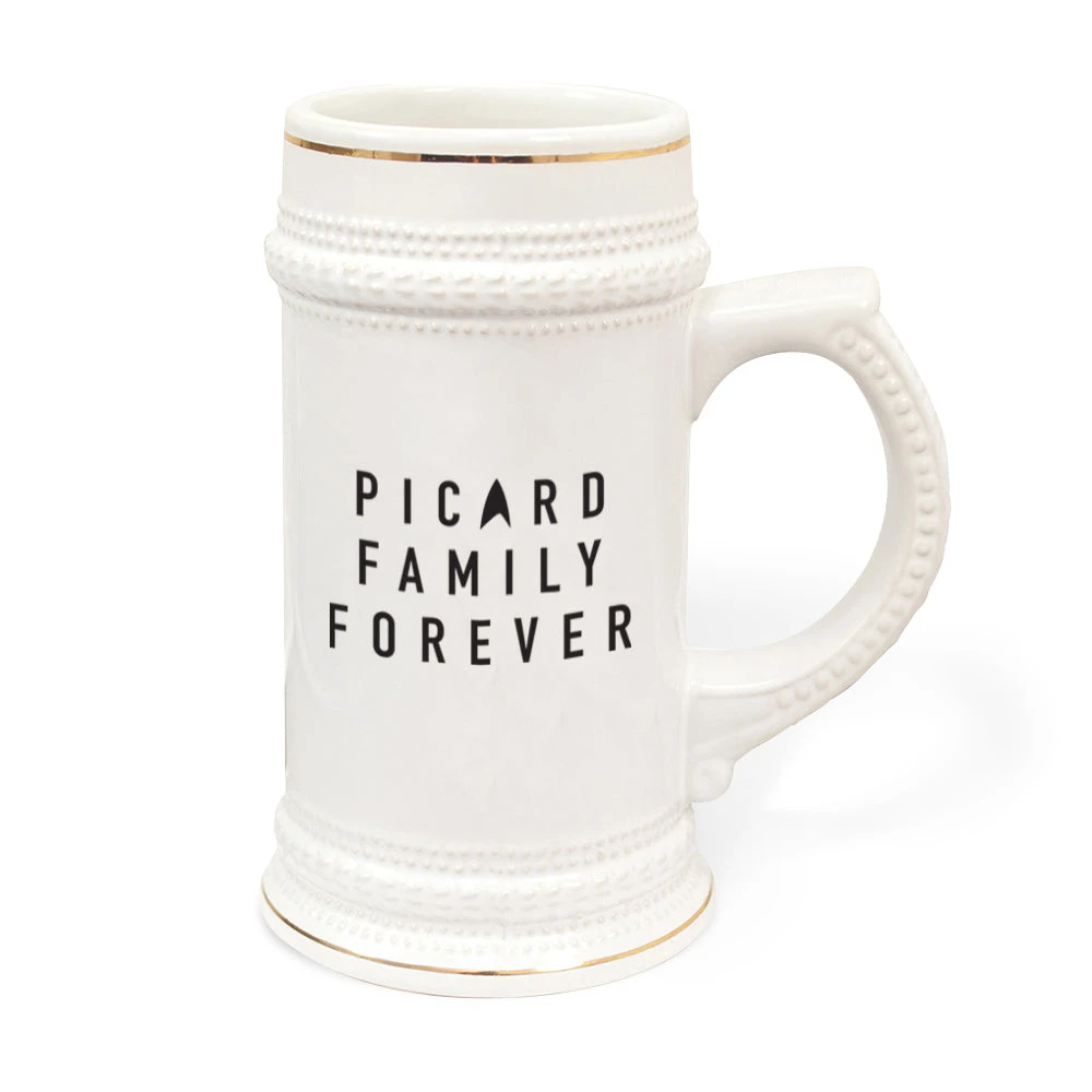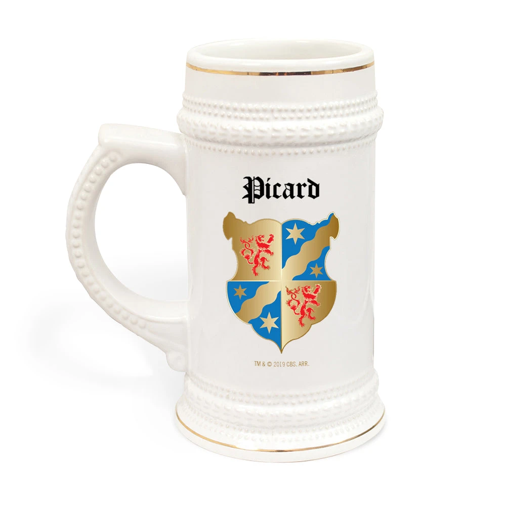 Raise a glass of your favorite beverage in this Star Trek: Picard Coat of Arms Picard Family Forever Beer Stein to show that your loyalty to the Picard family will never end. This beer stein also makes a great wedding, graduation, or holiday gift.