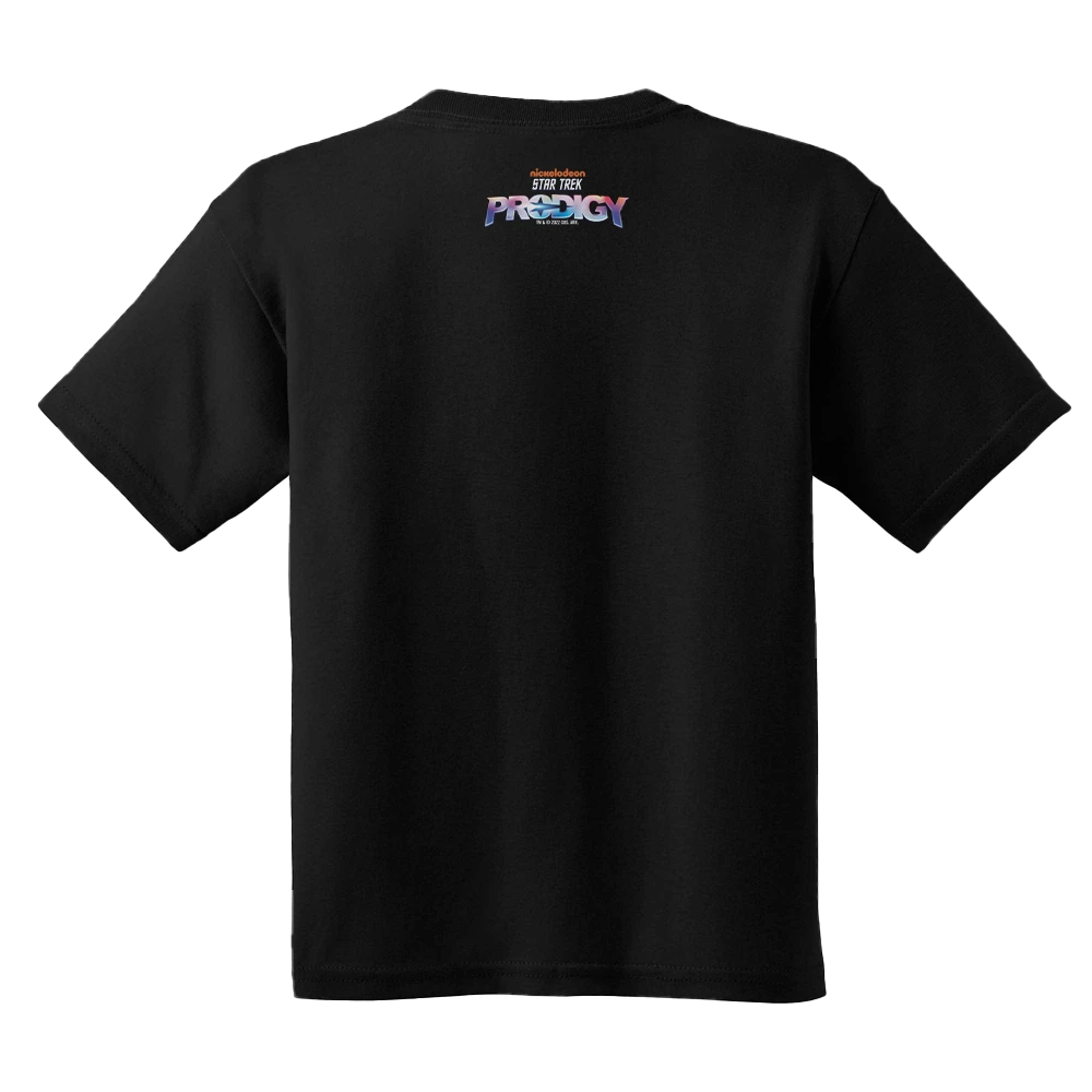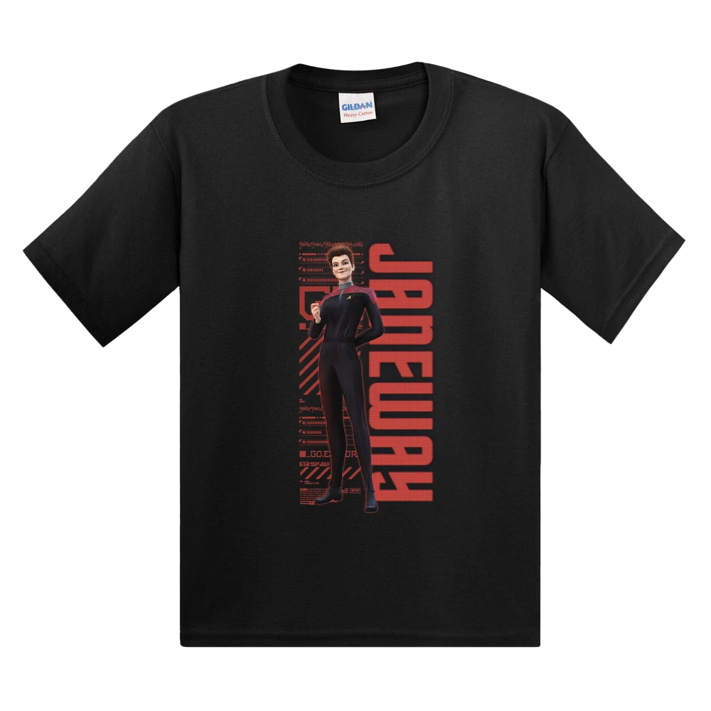 Modeled after the iconic Captain Janeway of the U.S.S. Voyager, the U.S.S. Protostar holographic trainer is part Starfleet advisor and part mentor to the new crew as they navigate their way through space and learn the principles of Starfleet and the Federation. Feel inspired to reach your full potential with the new Star Trek: Prodigy Janeway Kids Short Sleeve T-Shirt!