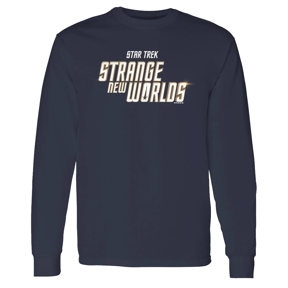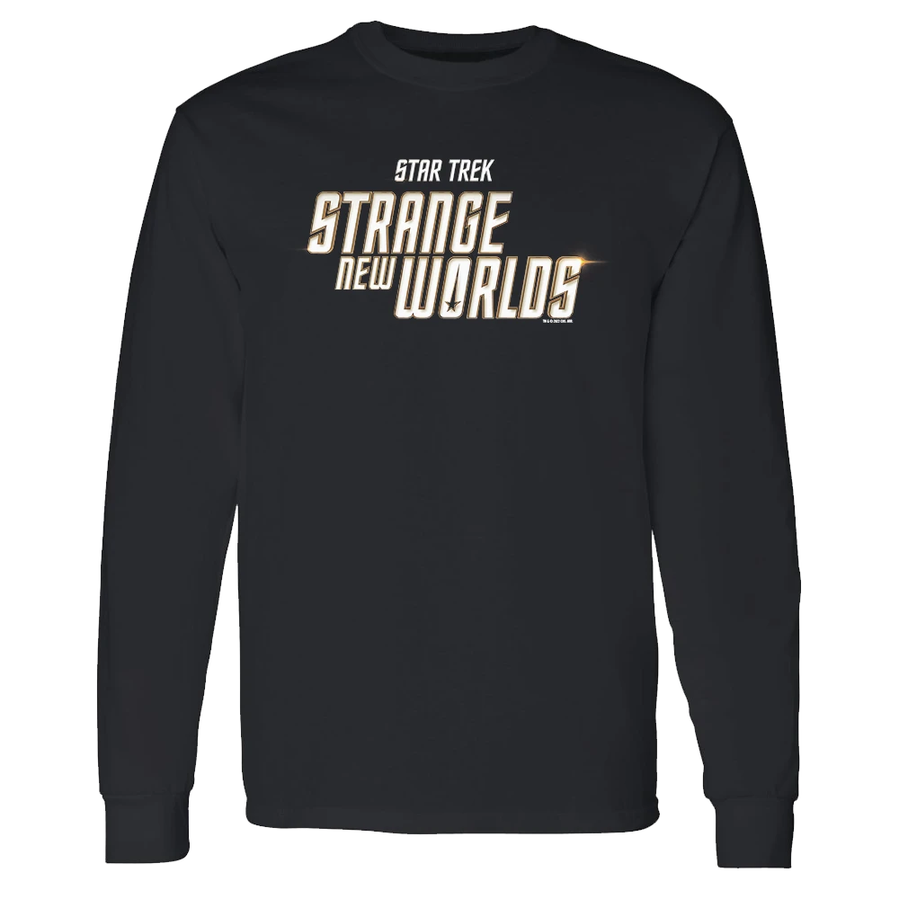 Light up the sky wearing this Star Trek: Strange New Worlds Flare Logo Adult Long Sleeve Shirt. Designed with the show logo in a glowing, sci-fi font, this comfy, long-sleeve tee is perfect for any fan. Â