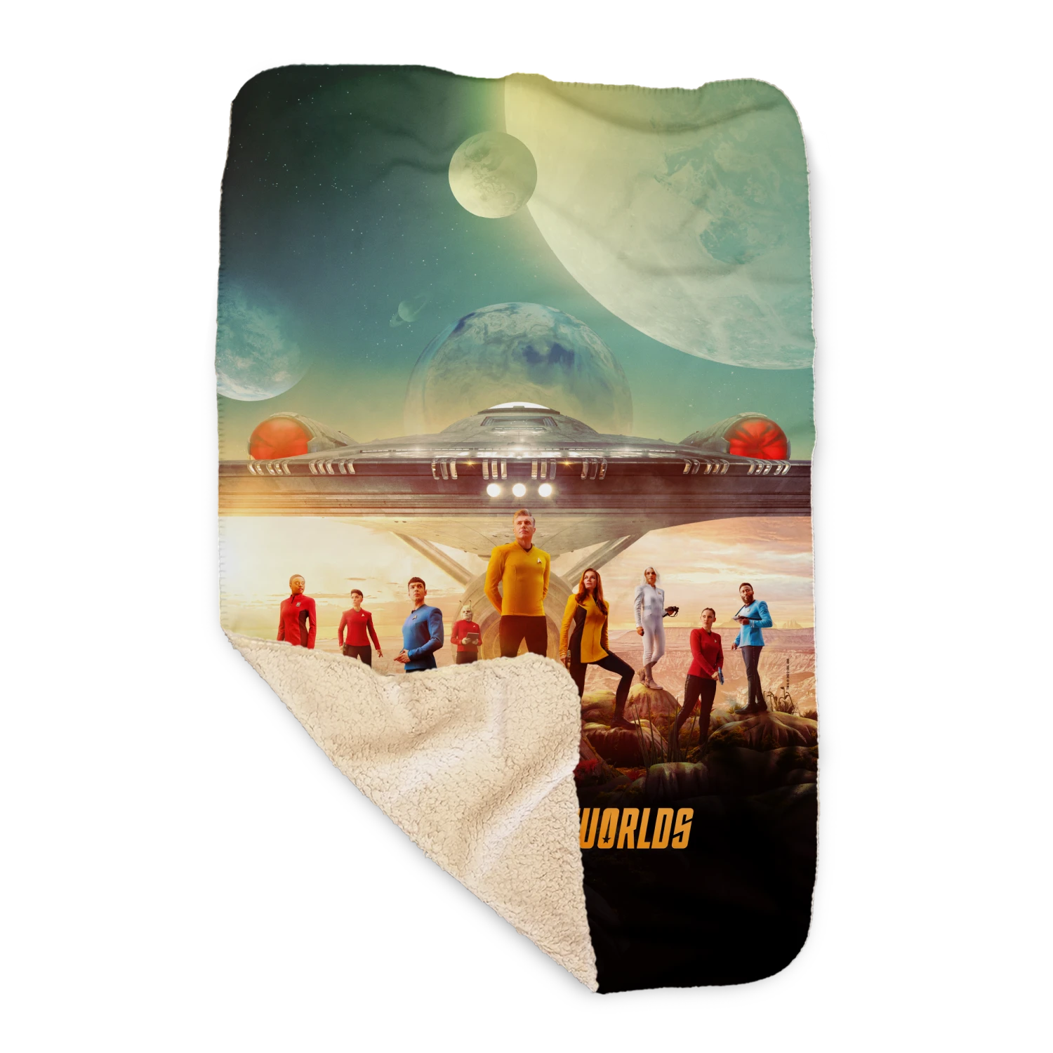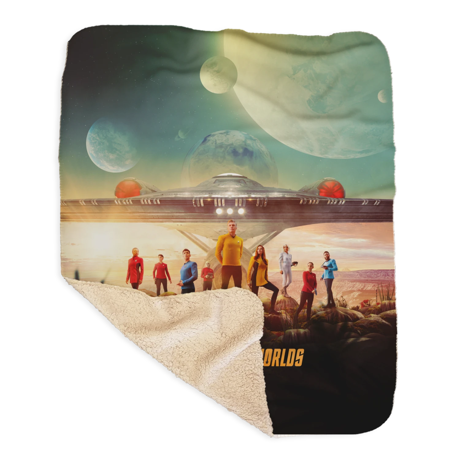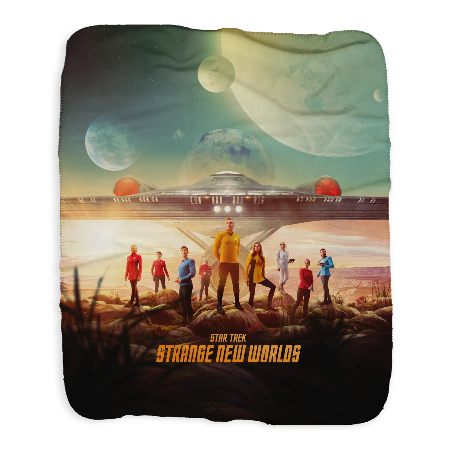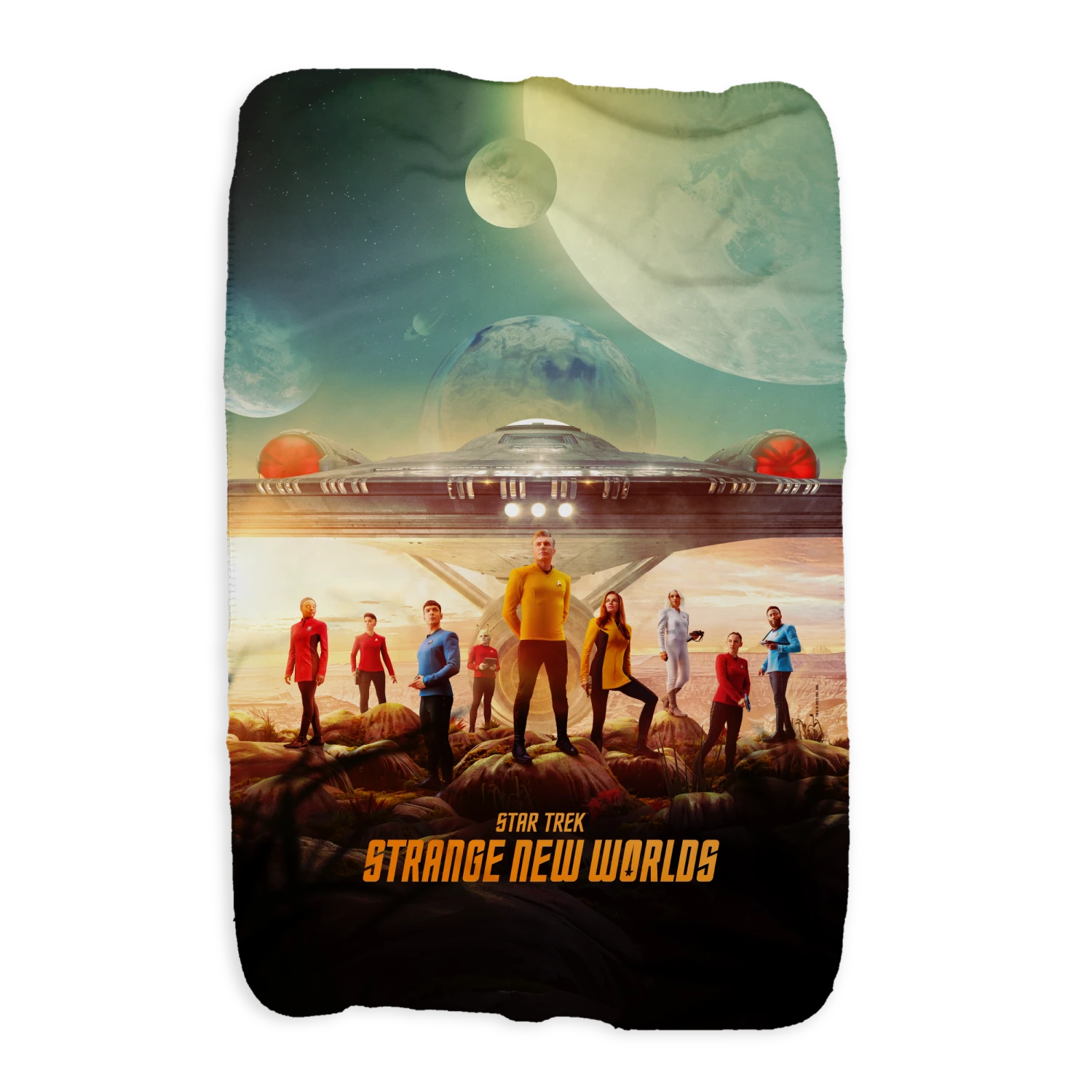 Snuggle up watching your favorite space drama with the Star Trek: Strange New Worlds Landing Party Key Art Sherpa Blanket. Printed with all your favorite crew members, this soft blanket comes in two sizes––perfect for your couch or bedspread.