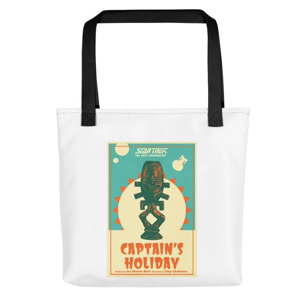 This stylish Star Trek: The Next Generation Juan Ortiz Captain’s Holiday Canvas Tote Bag is the perfect place to store all of your vacation essentials. Featuring the iconic Jamaharon idol above the Captain’s Holiday episode title, this tote bag lets you represent your favorite series anywhere you go.