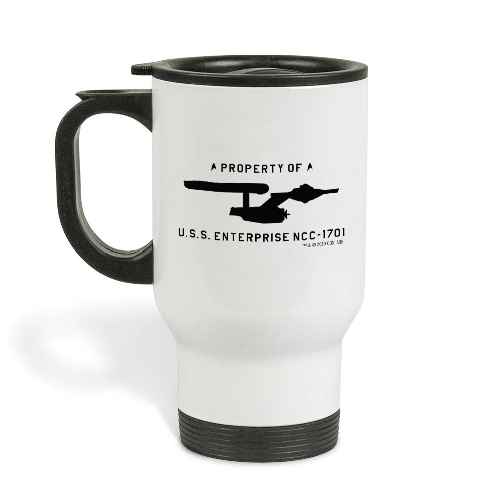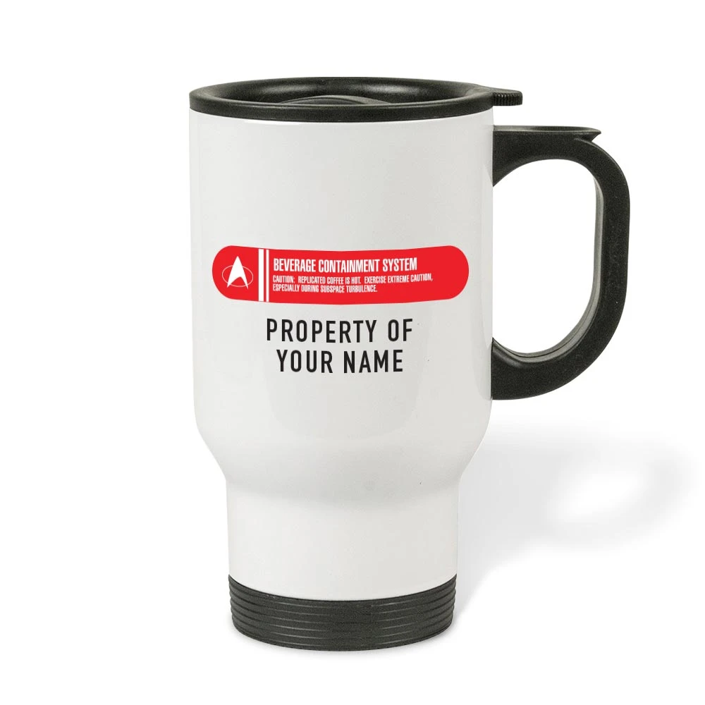Stay hydrated aboard the U.S.S. Enterprise NCC – 1701 with this Star Trek: The Original Series Beverage Containment System Travel Mug. Featuring your name on one side and the beloved U.S.S. Enterprise on the other, this mug will quickly become your go-to travel accessory.