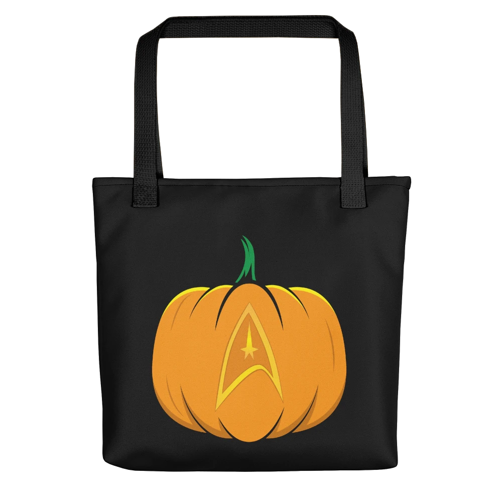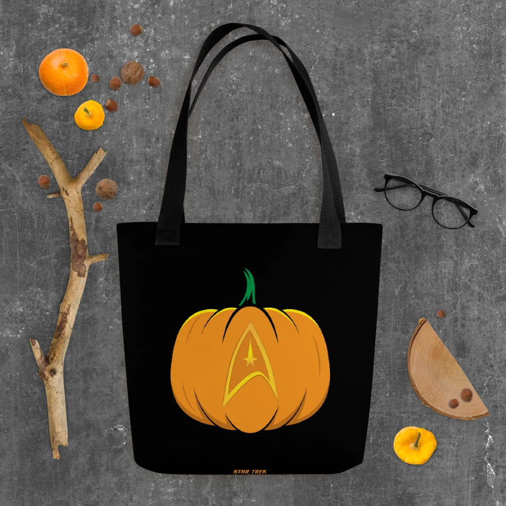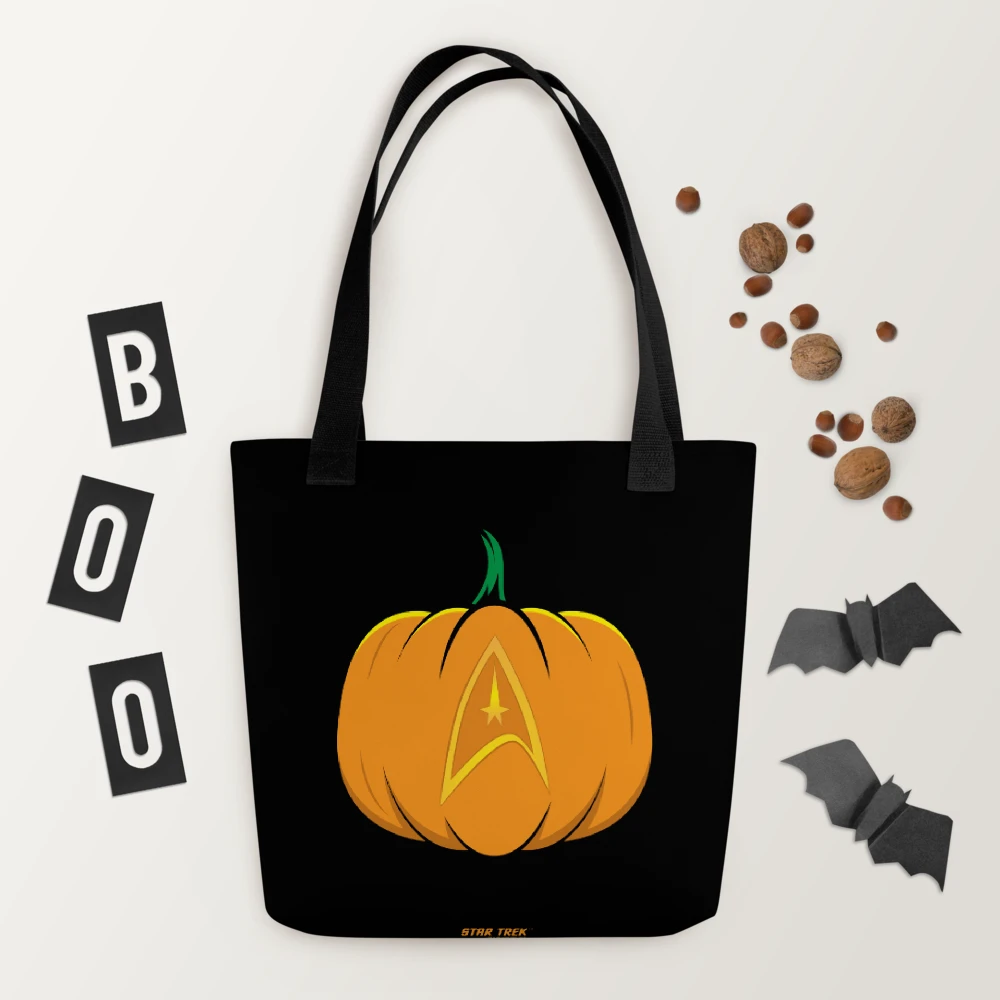 Featuring the Star Trek delta carved into a pumpkin, this Star Trek: The Original Series Delta Pumpkin Tote Bag will get any fan into the spirit of the season. Capable of holding spooky decorations, treats, and daily essentials, this tote bag is a versatile addition to any outfit.