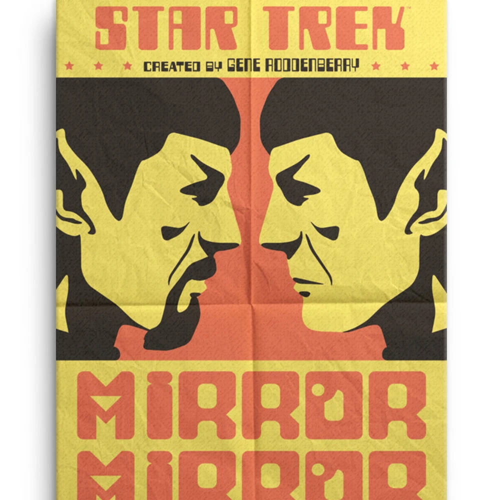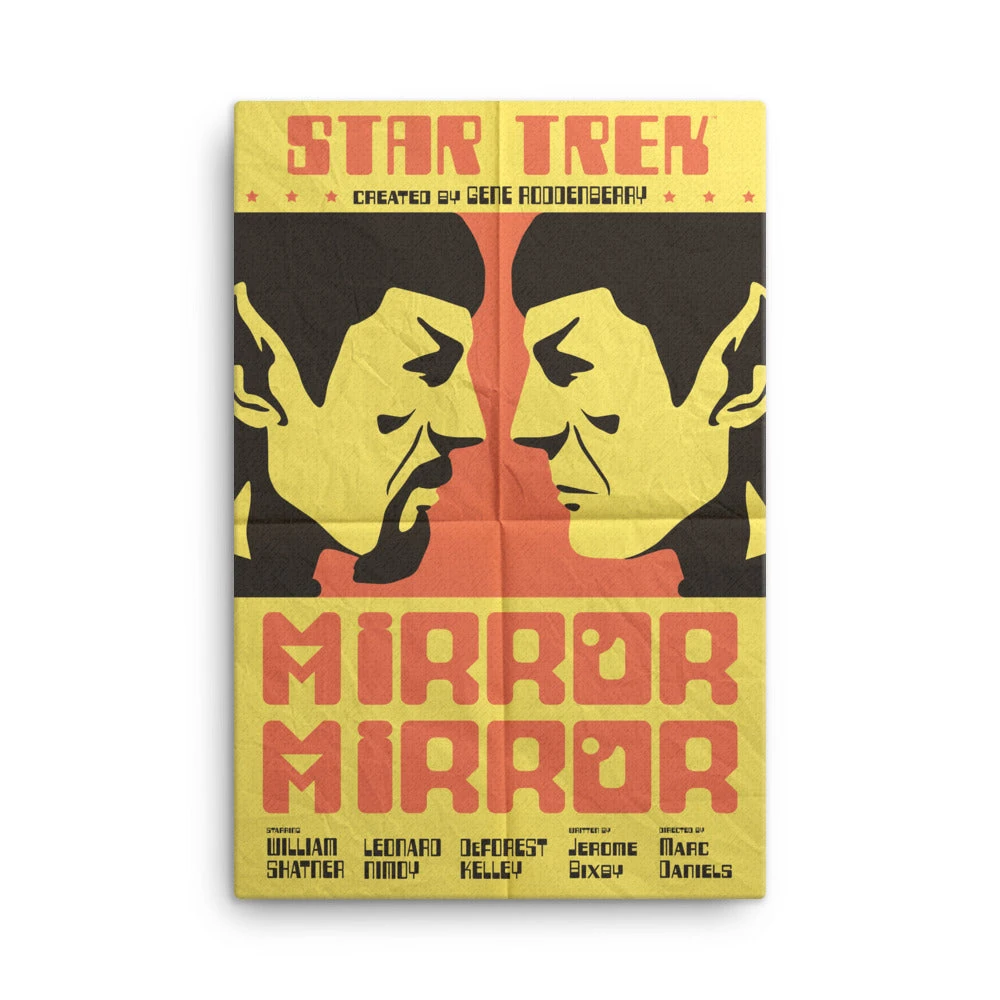 Step into a world where bad is good and evil is praised with this vivid Star Trek: The Original Series Juan Ortiz Mirror Mirror Gallery Wrapped Canvas. Featuring Spock and his evil counterpart, this poster perfectly captures the intensity of the “Mirror, Mirror” episode. Hang this poster up in any room of your choice to show your love for the greatest series in the galaxy.