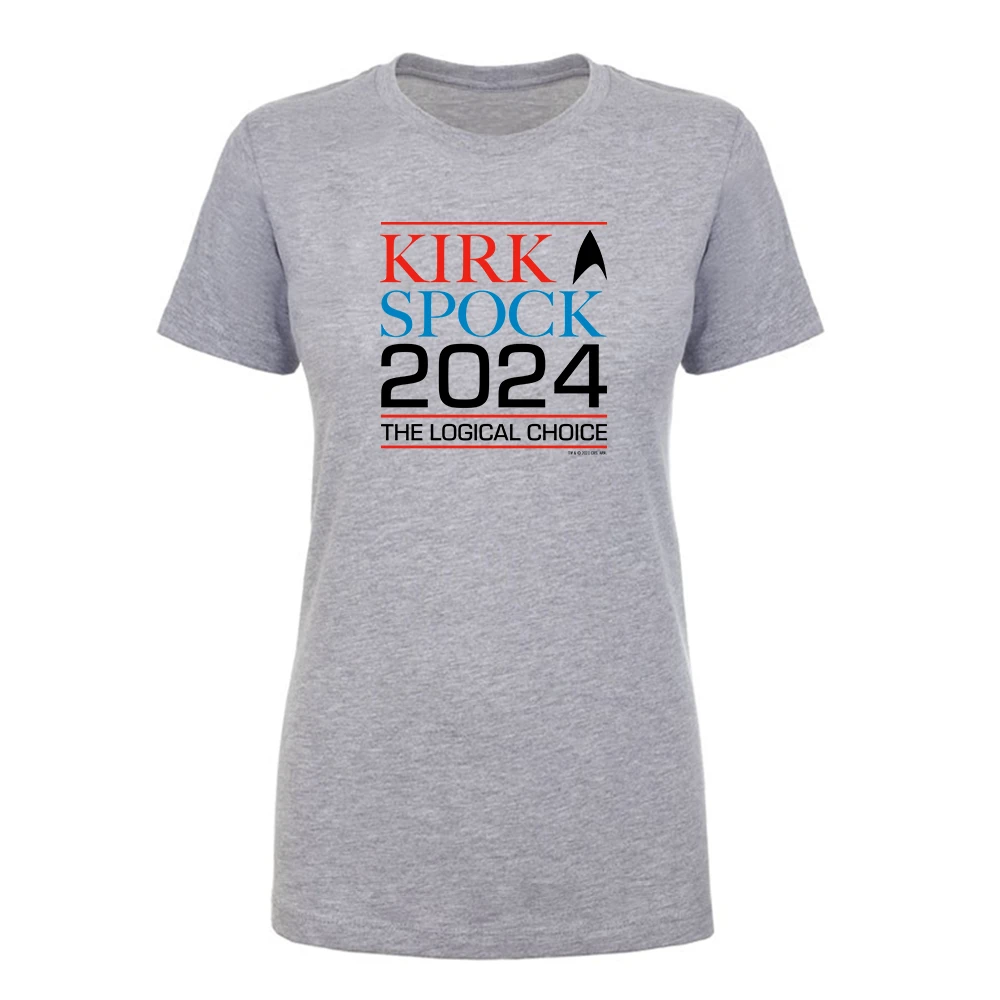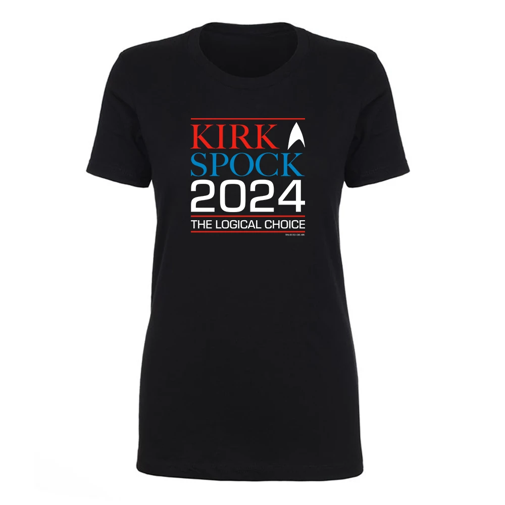 Not voting for Kirk-Spock 2024? That is highly illogical! Show the universe that you are a proud supporter of the Kirk-Spock campaign by wearing this comfortable Star Trek: The Original Series Kirk & Spock 2024 Women’s Short Sleeve T-Shirt around the galaxy.