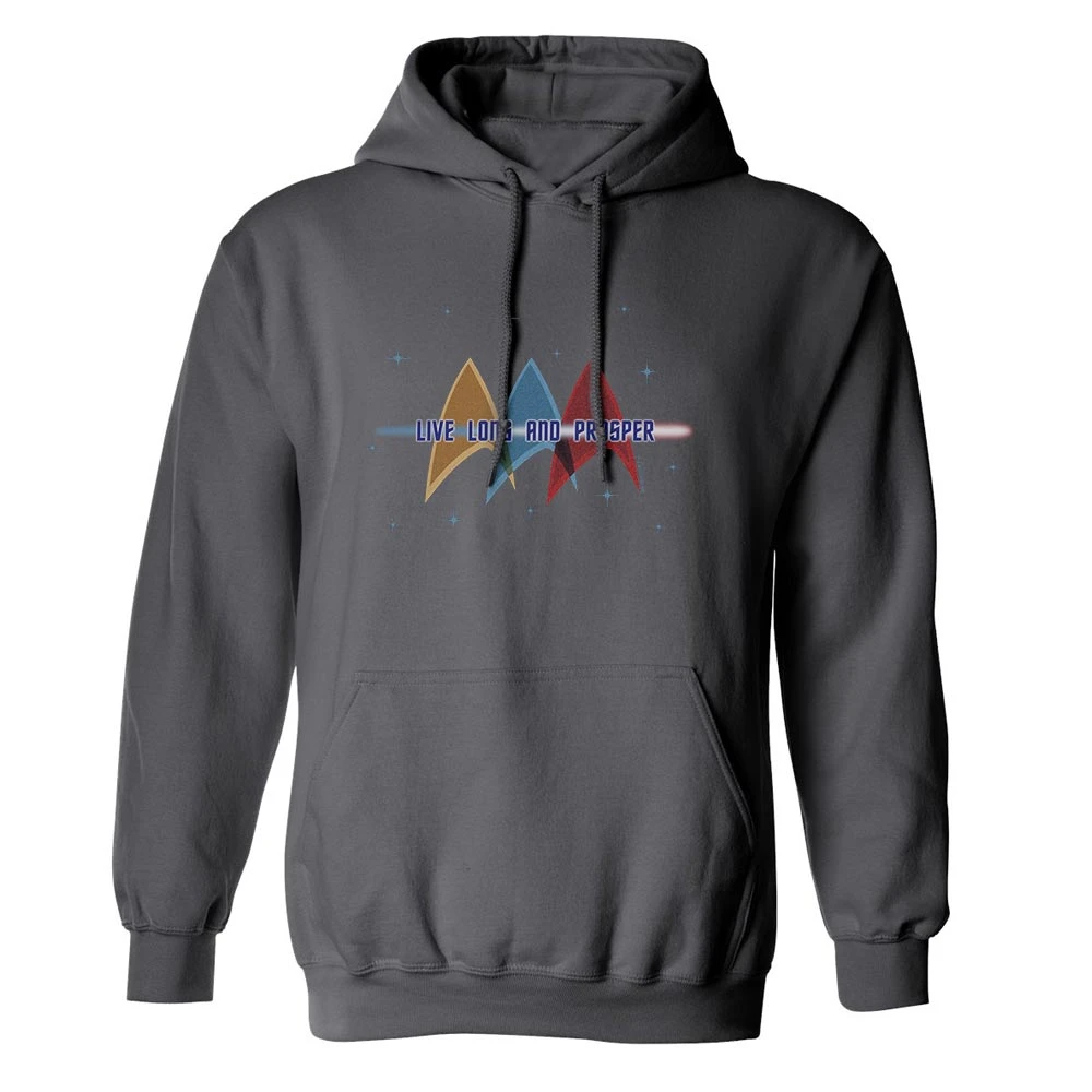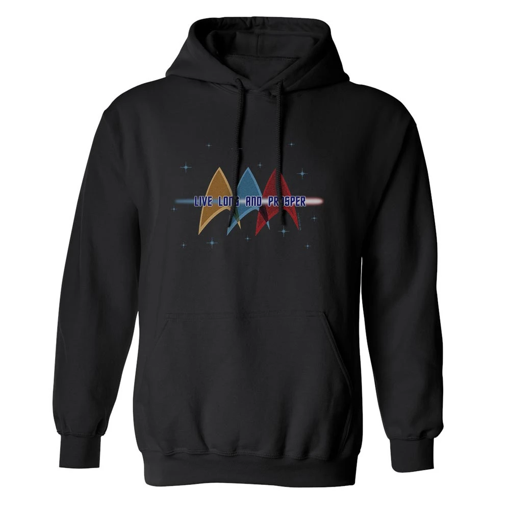 Live long and prosper in comfort and coziness anywhere in the galaxy when you wear this Star Trek: The Original Series Live Long and Prosper Deltas Fleece Hooded Sweatshirt. You are sure to get a few Vulcan greetings along the way with this sweatshirt!