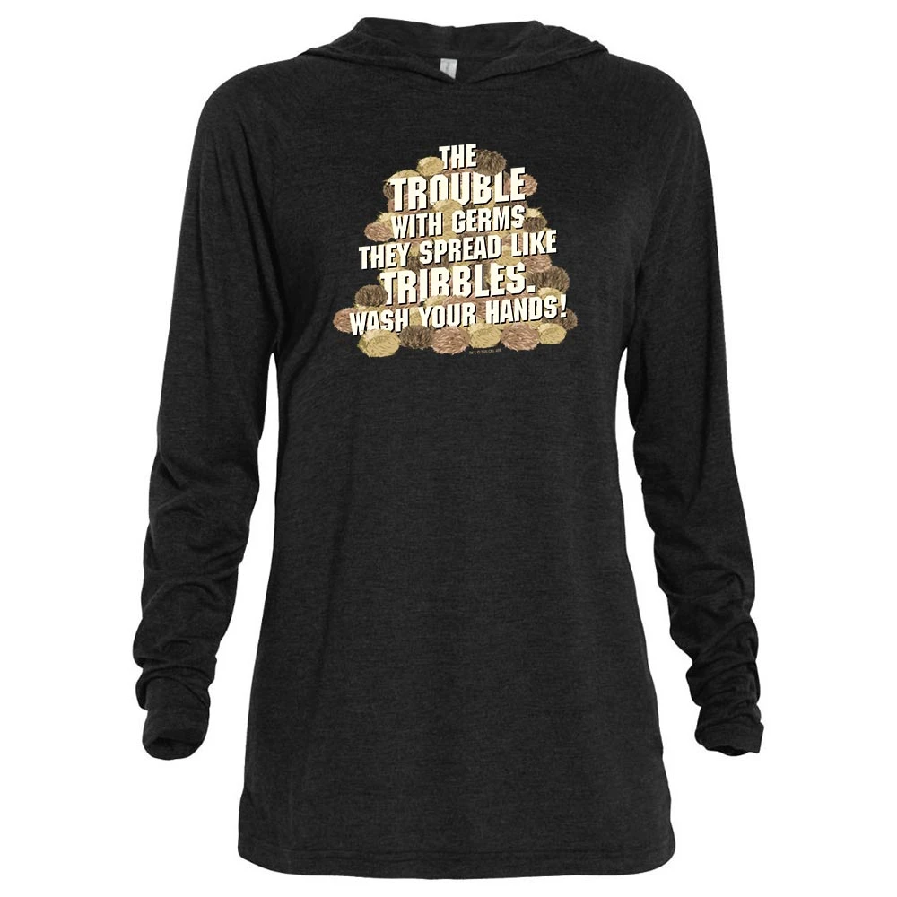 Cozy and soft, this Star Trek: The Original Series Wash Your Hands Tribbles Stack Tri-Blend Raglan Hoodie is a stylish way to remind the universe to keep their hands clean. By washing your hands, you can help stop germs from multiplying (if only it were so easy with Tribbles!).