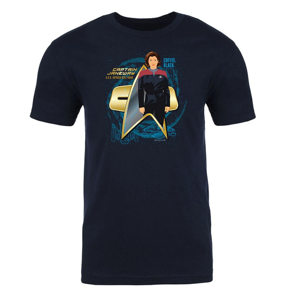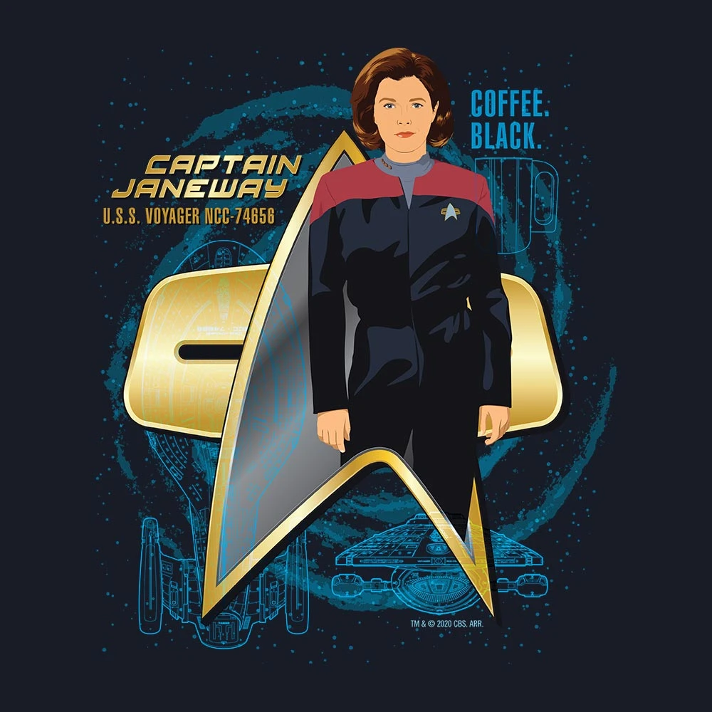 If there is one Star Trek captain that loves coffee more than any other, it is Captain Kathryn Janeway. Featuring a unique design displaying Kathryn Janeway, the U.S.S. Voyager, the classic Star Trek delta, and Janeway’s coffee order, this Star Trek: Voyager Captain Janeway Adult Short Sleeve T-Shirt lets you represent your favorite Star Trek captain with each wear.