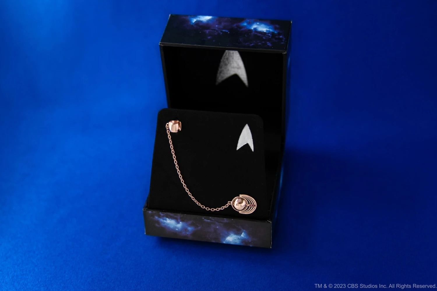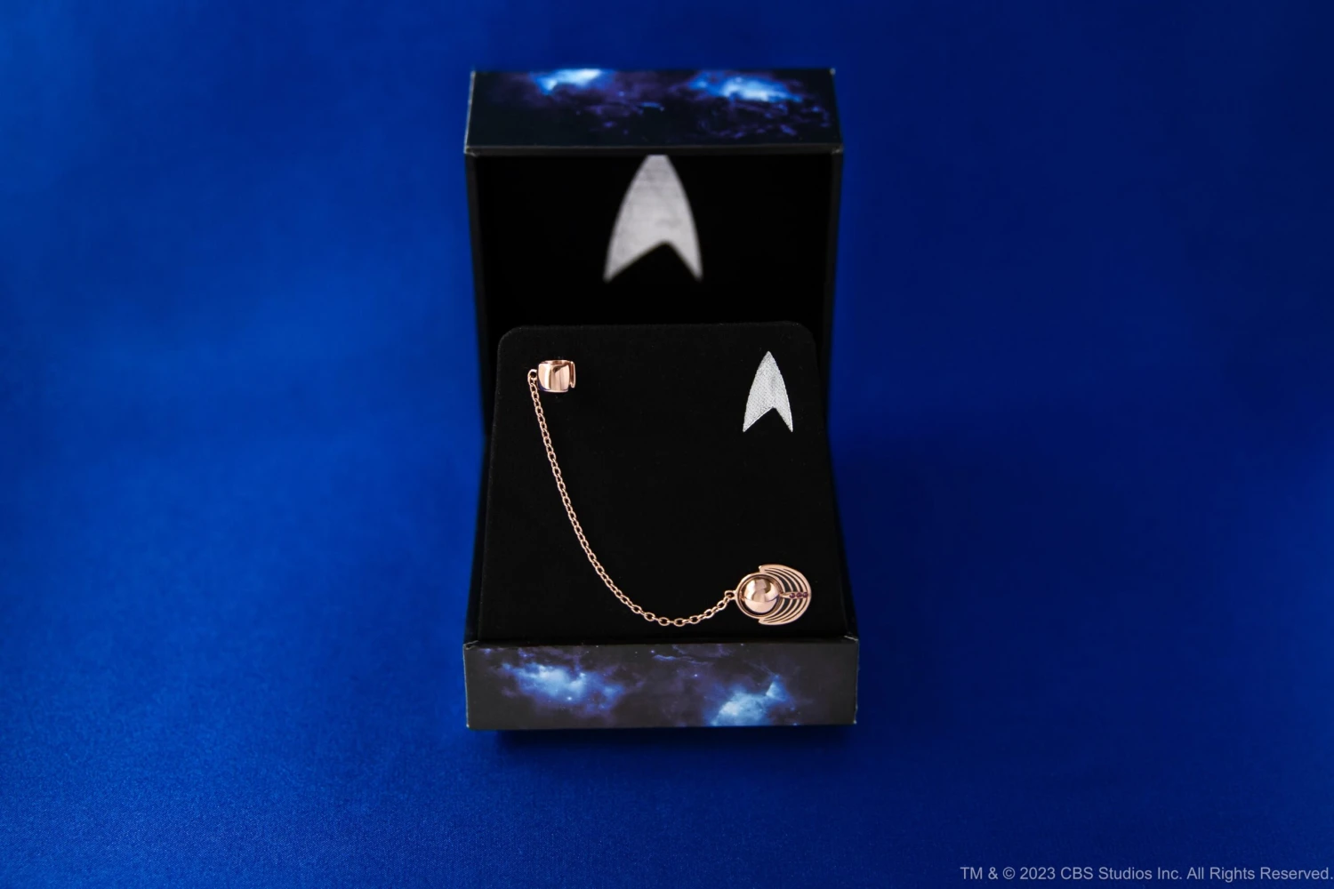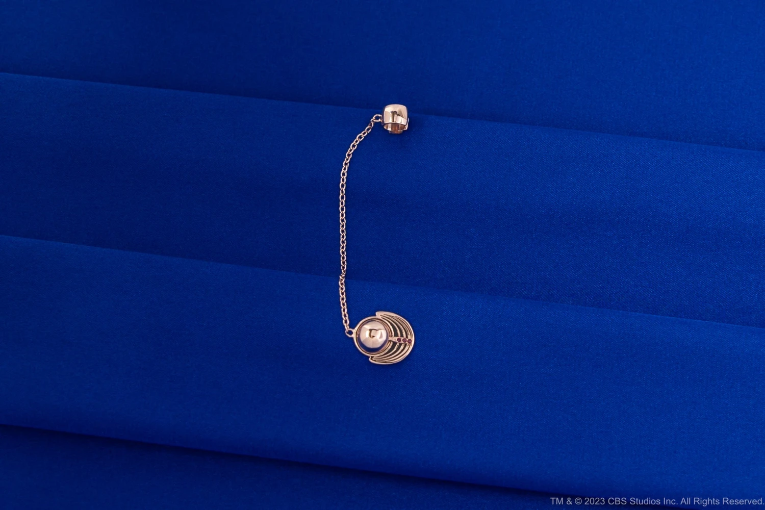Sculpted in solid sterling silver and plated in polished genuine rose gold, as seen in CBS’s series Star Trek: Picard. Featuring a single hole piercing, the stud connects with a chain to an accompanying cuff that gently attaches higher up the ear lobe.