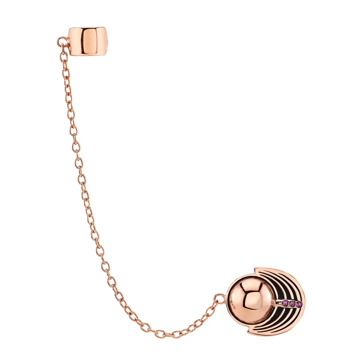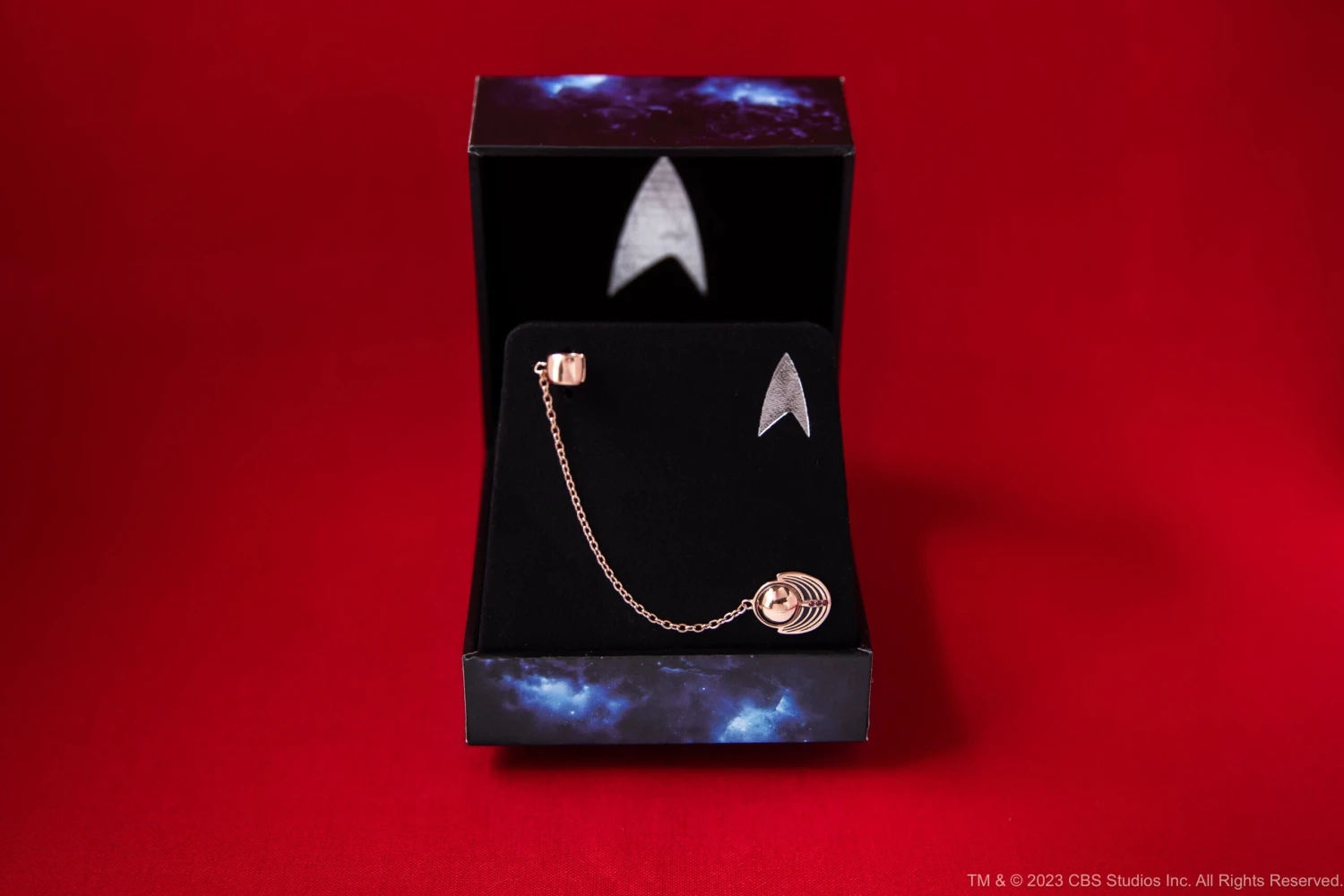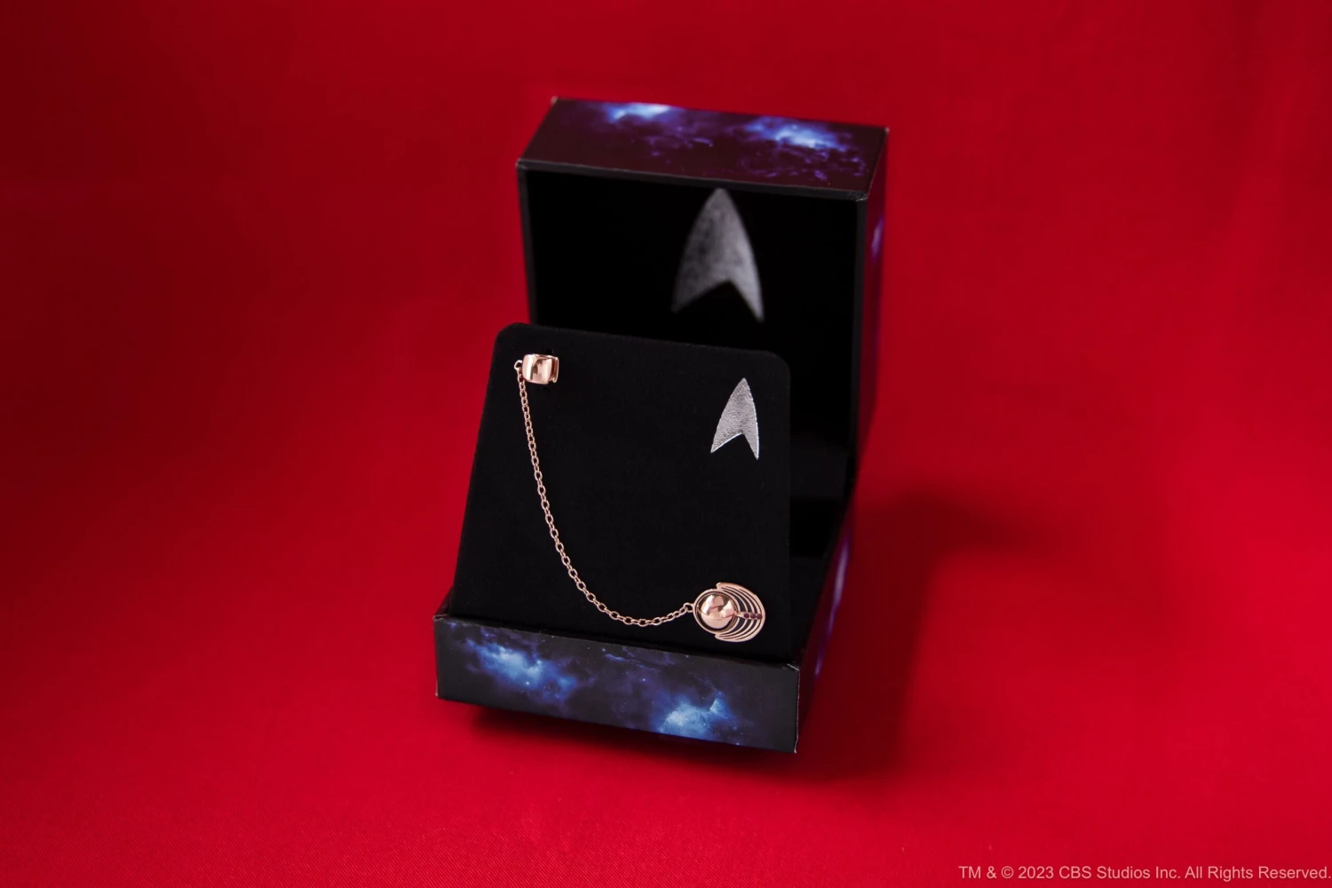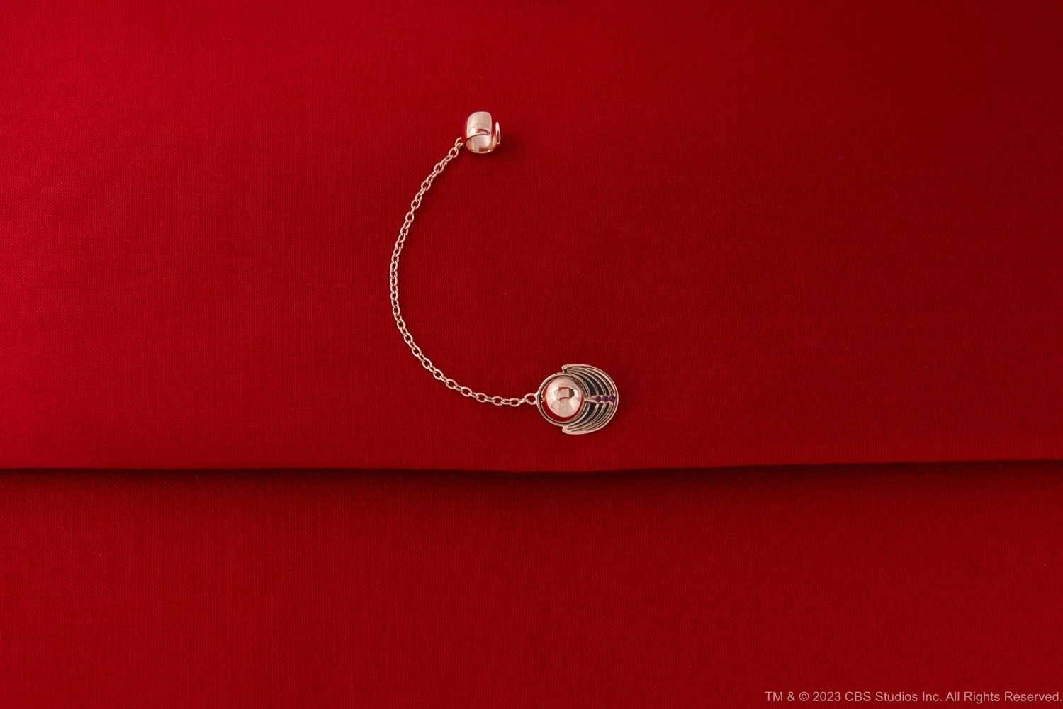 Sculpted in solid sterling silver and plated in polished genuine rose gold, as seen in CBS’s series Star Trek: Picard. Featuring a single hole piercing, the stud connects with a chain to an accompanying cuff that gently attaches higher up the ear lobe.